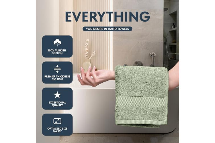 White Classic Luxury Light Green Hand Towels - Soft 100% Turkish Cotton | Highly Absorbent Hotel spa Bathroom Towel Collection | 16x30 Inch | Set of 6