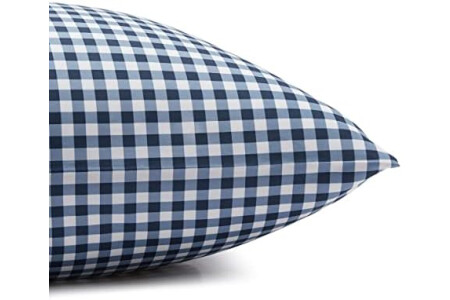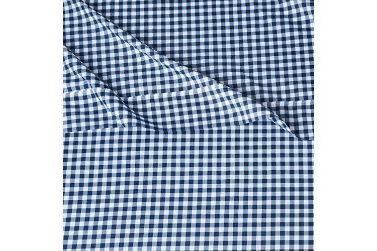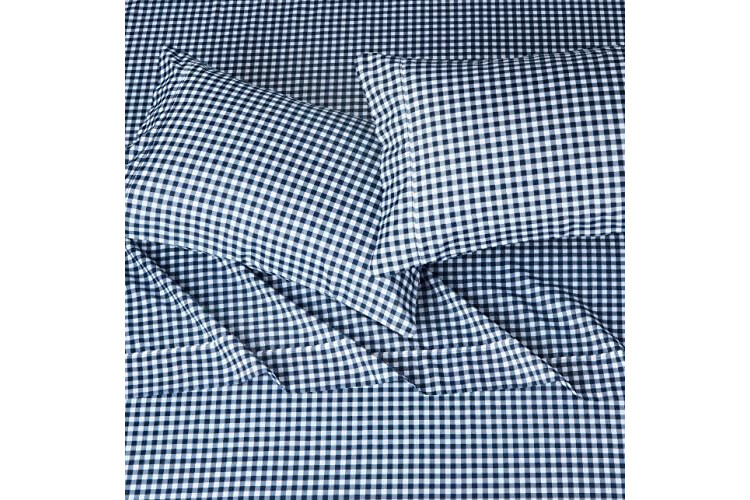 California King bed sheet set with Gingham Plaid print includes (1) 108 x 102-inch flat sheet, (1) 72 x 84 x 14-inch fitted sheet, and (2) 20 x 40-inch King pillowcases