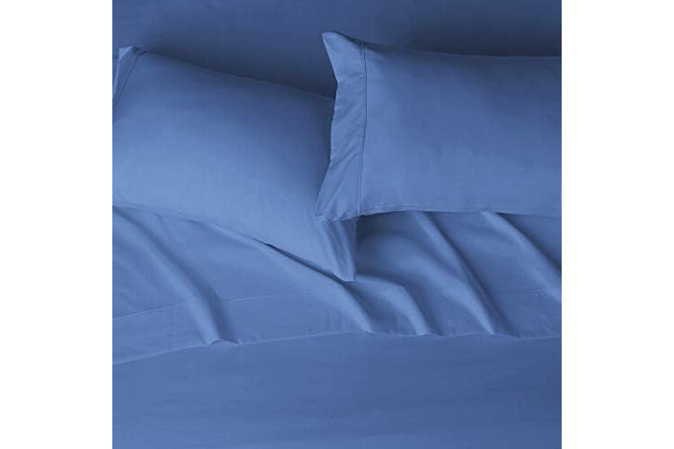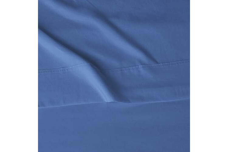 California King bed sheet set in Dutch Blue includes (1) 108 x 102-inch flat sheet, (1) 72 x 84 x 14-inch fitted sheet, and (2) 20 x 40-inch King pillowcases