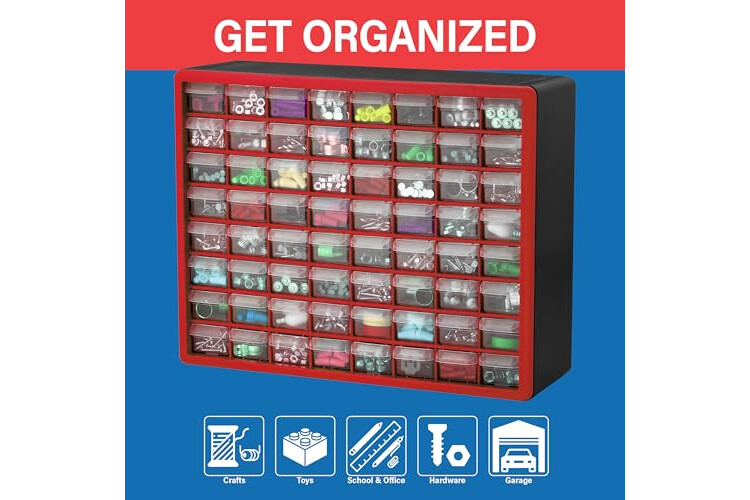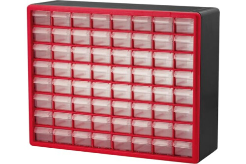 Akro-Mils 64-Drawer Plastic Drawer Storage Cabinet for Garage Organization, Bead Organizer, Building Bricks Storage, Teacher Toolbox, Makeup Organizer, 20" W x 6" D x 16" H, 10164 Red