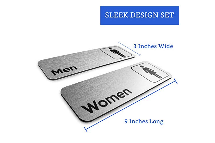 Set of 2 Restroom Signs: Our modern bathroom sign features 1 Women and 1 Men bathroom signs for door or smooth surface walls. These metal bathroom signs are Ideal for businesses, offices, restaurants, churches, homes, and any setting where a touch of style is desired.