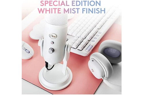 The Blue Yeti USB microphone features a special White Mist finish and exclusive Streamlabs Aurora themes to match your Aurora Collection Logitech G headset, mouse and keyboard.