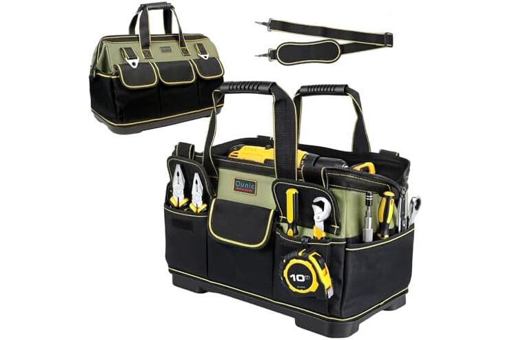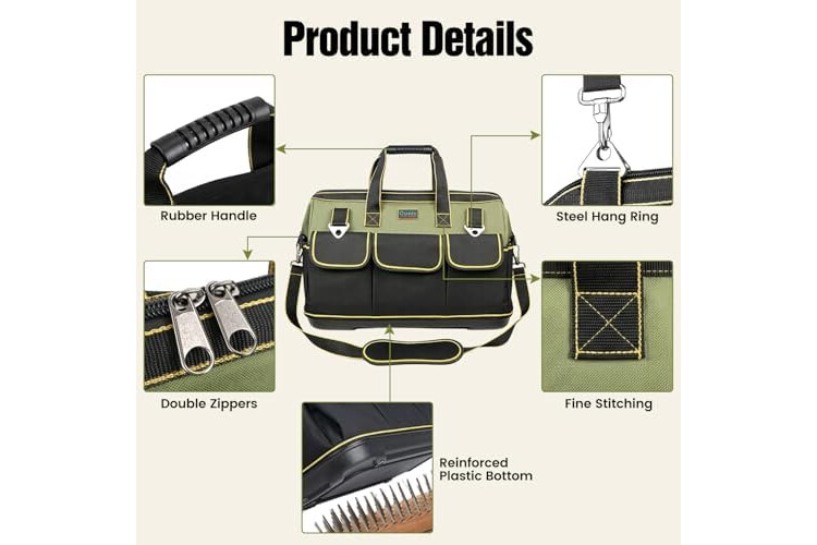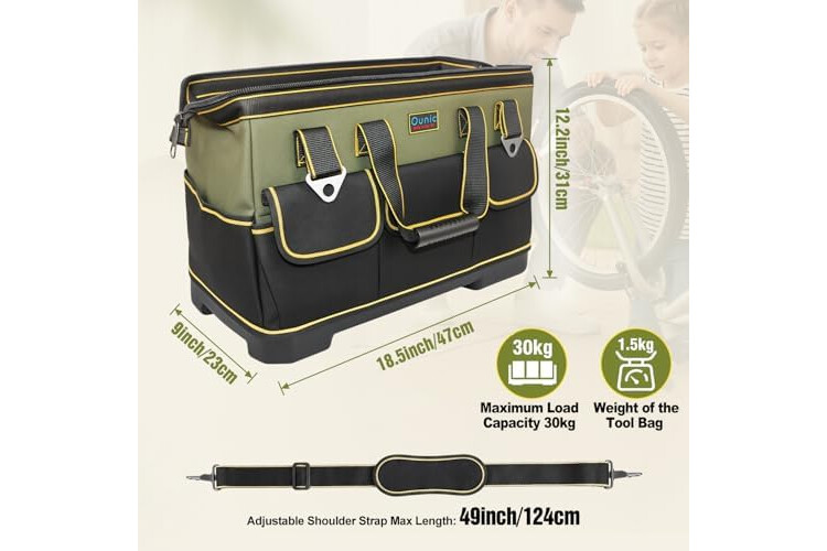 Tool Bag, Ounic 18 Inch Large Tool Tote Bag Heavy Duty With Waterproof Molded Base, Wide Mouth Tool Box Organizer with Adjustable Shoulder Strap for Electrician Mechanic Craftsman Plumbers(Green)