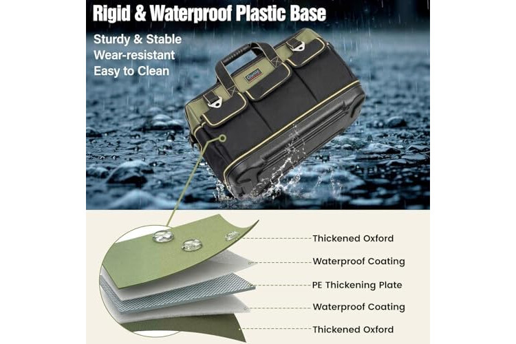 Sturdy and Durable: The tool bag is made of high-quality Oxford cloth (five-layer synthesis: Oxford cloth, waterproof layer, PE thick plastic board, waterproof layer, Oxford cloth) and reinforced with a PP plastic waterproof base, providing superior toughness, strength, resistance to dirt, and long-lasting durability, making it suitable for use in various harsh working environments.heavy duty tool bag Maximum load capacity 30kg