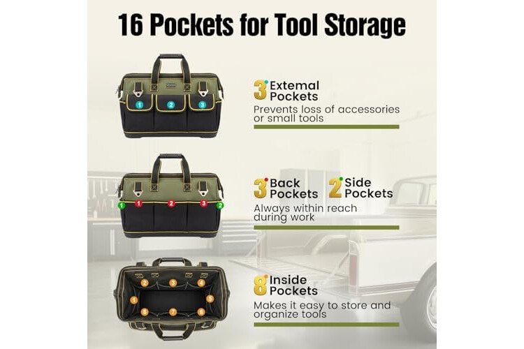 16 Pockets and Large Capacity: This tool tote bag has 8 pockets on the inside and 8 pockets on the outside for versatile storage of wrenches, pliers, screwdrivers and accessories. These pockets can be used to sort and hold small tools, and make them organized and secure. The bag is designed with large interior space which affords you retrieval of any tool