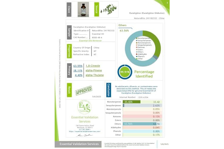 All NaturoBliss Essential Oils are tested by an independent lab to test the efficacy of each oil. Each oil is tested for its constituents as well as to have no fillers, additives and to be undiluted.