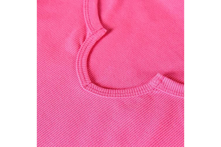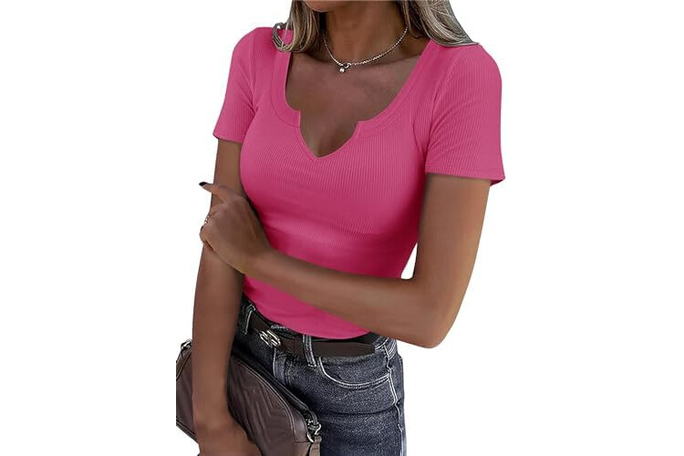 Roselux Women V Neck Ribbed Short Sleeve Shirt Fitted Basic Henley Knit Top