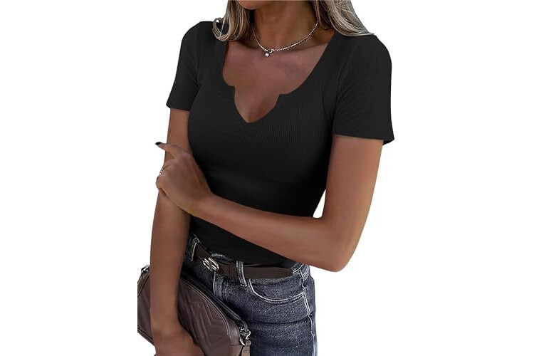 Roselux Women V Neck Ribbed Short Sleeve Shirt Fitted Basic Henley Knit Top