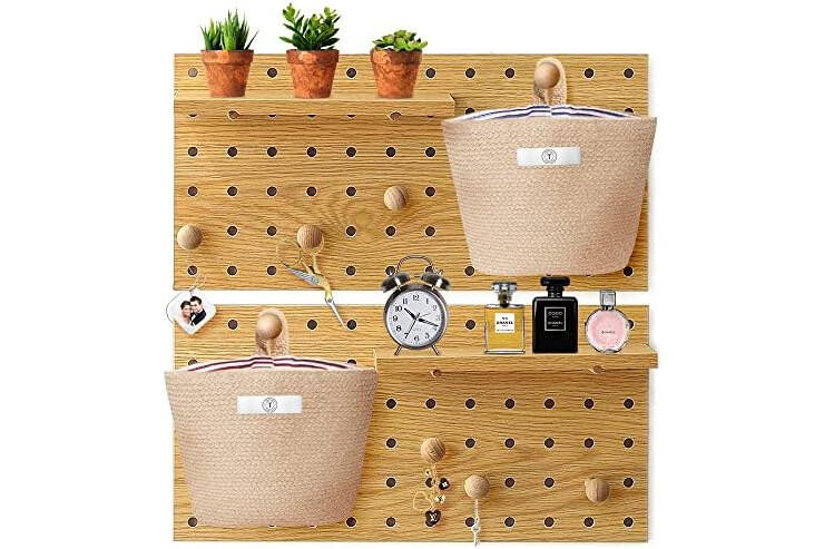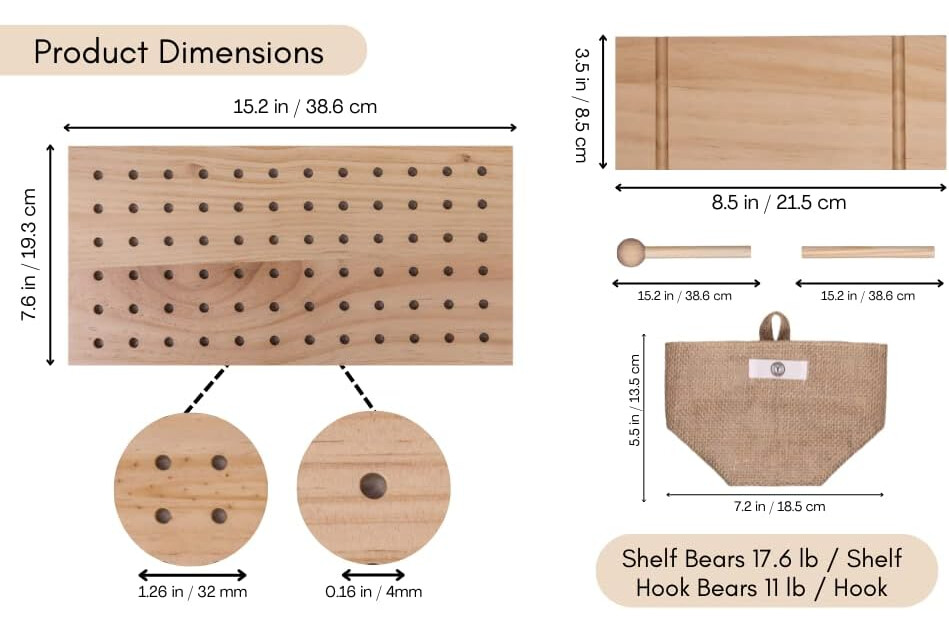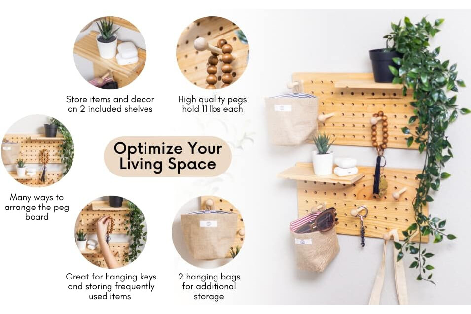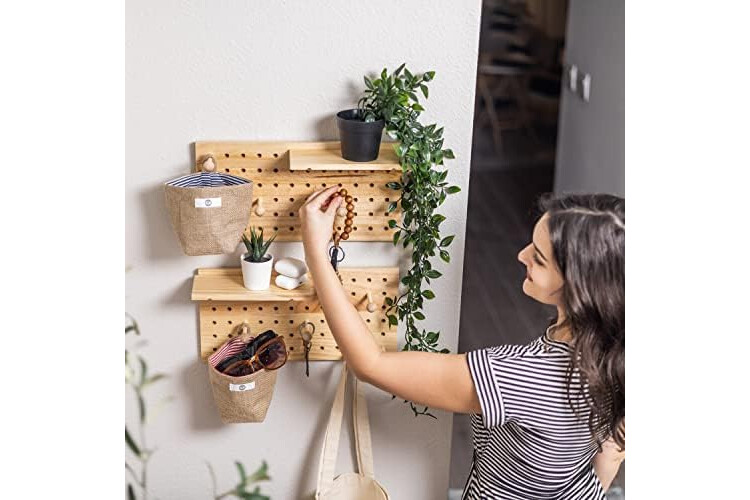 2 Wall Organizer with Wooden Board and 2 Bags - Wall Mount - Includes Panel and Ornaments - Natural