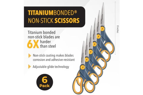 Westcott 8-Inch Non-Stick Titanium Scissors For Office and Home - Glide Adjust Technology - Grey/Yellow Craft, Fabric Scissors - 6 Pack