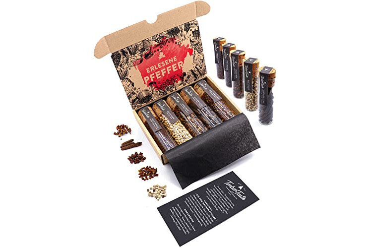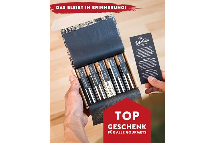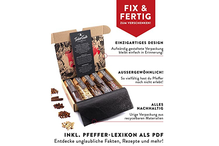 TIMBER TASTE® Pfeffer Geschenkset für Männer & Frauen - 5 erlesene Gewürze aus aller Welt als besonderes Geschenk für Erwachsene & Pfefferliebhaber - Gewürz Set Genusspaket Geschenke zum Geburtstag