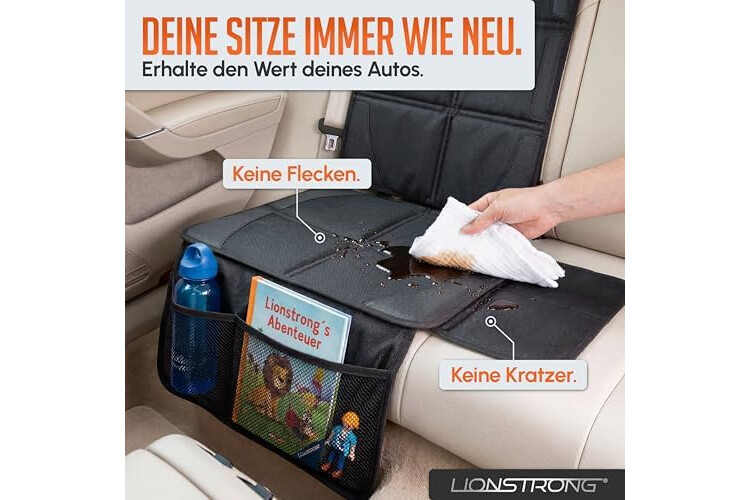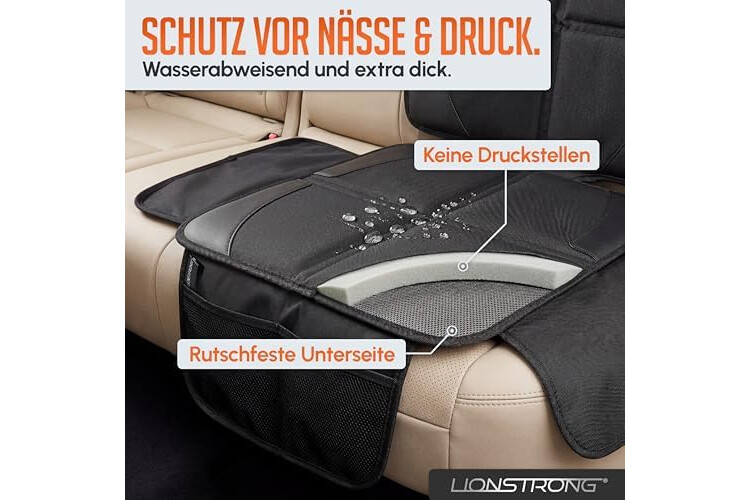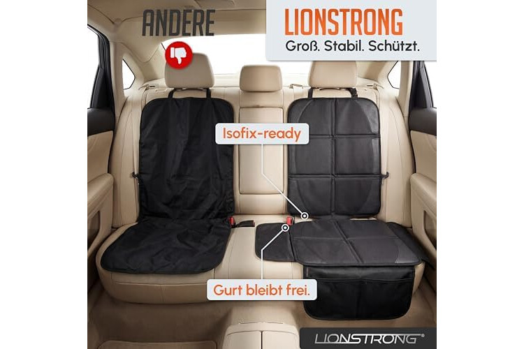 LIONSTRONG® Kindersitzunterlage Autositzschoner [ISOFIX GEEIGNET] - wasserabweisender Polyester Stoff schwarz - Sitzschutz Sitzschoner Auto Kindersitz - universell kompatibel (Schwarz)