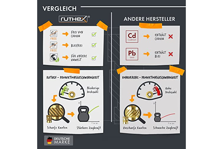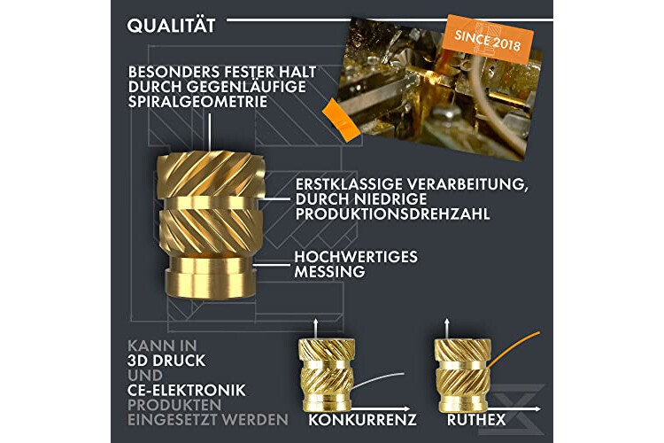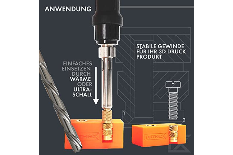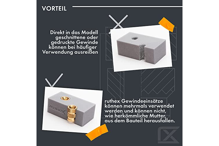 PRAKTISCHES GEWINDEEINSATZ-SET – Das ruthex Set enthält 100 hochwertige M3 x 5,7 mm Einpressgewinde. Die Einschmelzmuttern sind perfekt für jedes 3D-Druck-Projekt. Artikel-Nr.: GE-M3x57-001