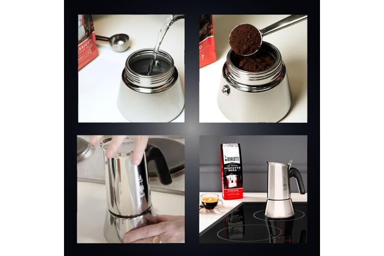 Wie benutzt man Bialetti Venus: Füllen Sie ihn mit gemahlenem Kaffee, schließen Sie die Kaffeemaschine und stellen Sie sie auf den Herd, sobald die Bialetti Venus fängt an zu gurgeln, macht das Feuer aus und der Kaffee ist fertig