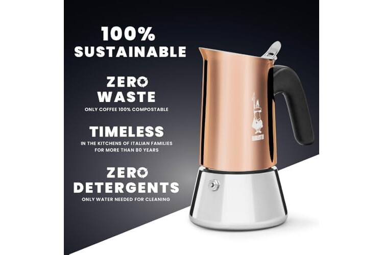 Venus Bialetti besteht aus 18/10 Edelstahl von höchster Qualität, was andauernde Haltbarkeit und einen unverwechselbaren Stil garantiert. Noch exklusiver wird der Kessel durch seine charakteristische Bronzefarbe.
