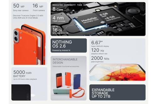 ALLE DETAILS, JEDES MAL - Dank der einzigartigen 50 MP Sony Kamera auf der Rückseite gelingen dir mit CMF Phone 1 wunderbare Naturaufnahmen und ein dedizierter Portraitsensor hilft dir, deine Objekte so richtig zum Leben zu erwecken. Mit ƒ/1,8-Blende und einem Sichtfeld...