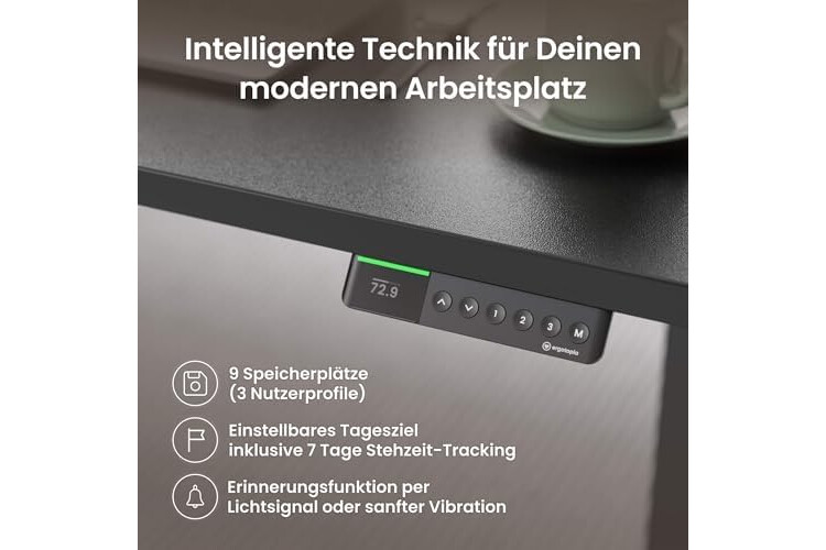 𝗕𝗲𝘄𝗲𝗴𝘂𝗻𝗴𝘀𝗲𝗿𝗶𝗻𝗻𝗲𝗿𝘂𝗻𝗴, 𝗭𝗶𝗲𝗹𝗲𝗳𝘂𝗻𝗸𝘁𝗶𝗼𝗻 𝘂𝗻𝗱 𝗦𝘁𝗲𝗵𝘇𝗲𝗶𝘁 𝗧𝗿𝗮𝗰𝗸𝗶𝗻𝗴 - Frei konfigurierbarer Reminder per Lichtsignal und/oder sanfter Vibration + motivierende Tageszielfunktion mit Fortschrittsanzeige für mehr gesunde Bewegung. Lass Dir den Fortschritt der letzten 7 Tage in einem Diagramm direkt am Tischdisplay anzeigen.