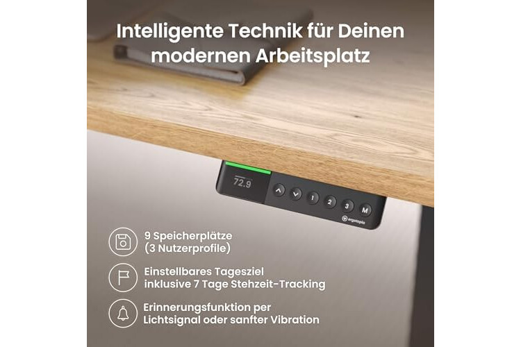 𝗕𝗲𝘄𝗲𝗴𝘂𝗻𝗴𝘀𝗲𝗿𝗶𝗻𝗻𝗲𝗿𝘂𝗻𝗴, 𝗭𝗶𝗲𝗹𝗲𝗳𝘂𝗻𝗸𝘁𝗶𝗼𝗻 𝘂𝗻𝗱 𝗦𝘁𝗲𝗵𝘇𝗲𝗶𝘁 𝗧𝗿𝗮𝗰𝗸𝗶𝗻𝗴 - Frei konfigurierbarer Reminder per Lichtsignal und/oder sanfter Vibration + motivierende Tageszielfunktion mit Fortschrittsanzeige für mehr gesunde Bewegung. Lass Dir den Fortschritt der letzten 7 Tage in einem Diagramm direkt am Tischdisplay anzeigen.