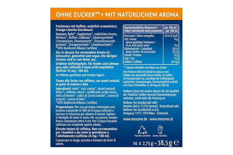 Früchtetee mit Koffein, natürlich aromatisiert, Orange-Limette-Geschmack |