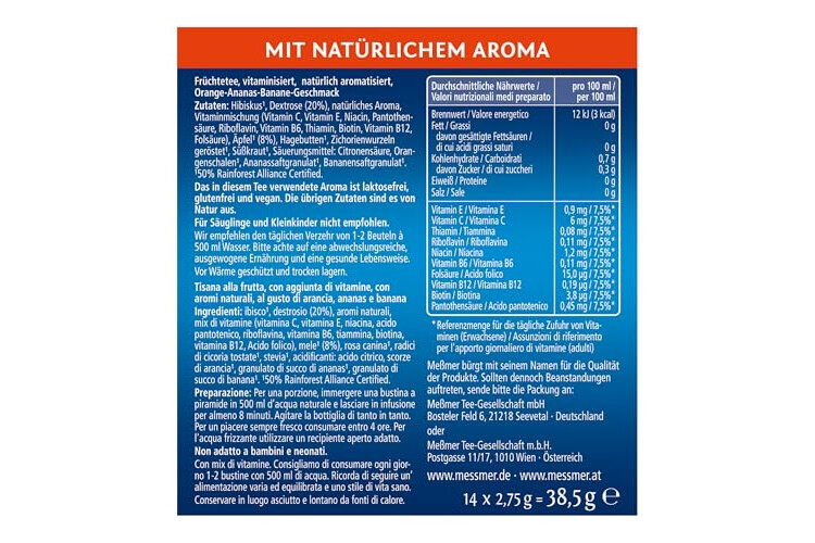 | Produktbezeichnung | Früchtetee, vitaminisiert, natürlich aromatisiert, Orange-Ananas-Banane-Geschmack |
