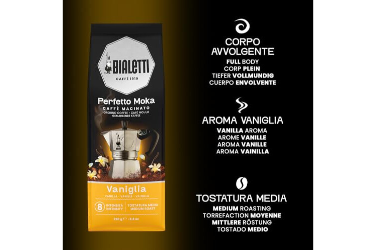 | Produktbezeichnung | Bialetti Perfetto Moka (der perfekte Kaffee für den Moka), Gemahlener Kaffee - VANILLE Geschmack (Vanillegeschmack), 250 gr |