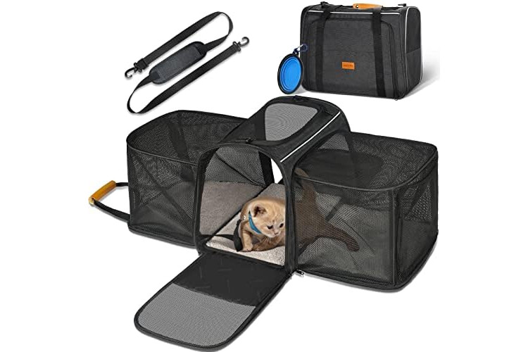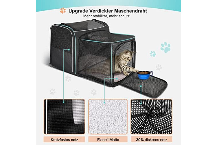 • Robuste Katzentransportbox: Diese katzen transportboxen ist aus 4,0 mm dickem rahmenmaterial und wasserfest 600D Oxford-gewebe eingebaut, um die transporttasche katze aufrecht zu halten und haustiere zu entspannen.Die 2 erweiterbar netzfenster halten es gut in form und kollabieren nach dem erweitern nicht, wodurch 50 % mehr aktivitätsraum für ihre haustiere entsteht.