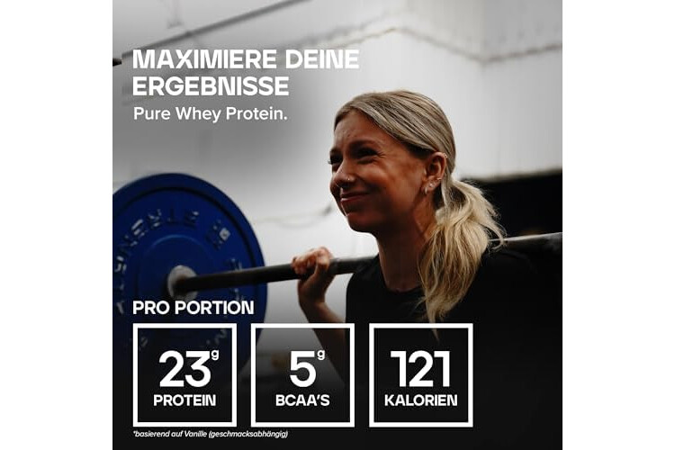 Enthält 26g hochwertiges Protein pro Portion aus Molkenproteinkonzentrat zur Unterstützung deiner täglichen Ernährung und Fitnessziele.