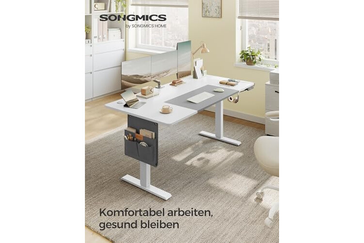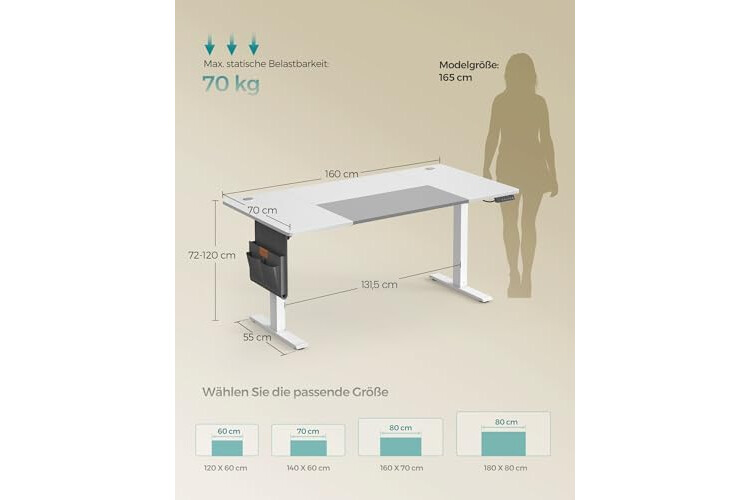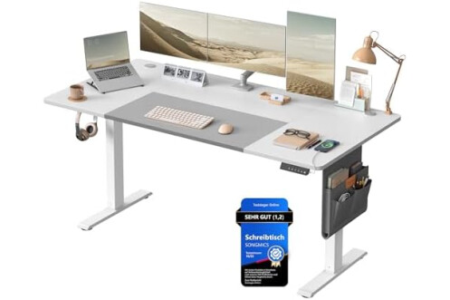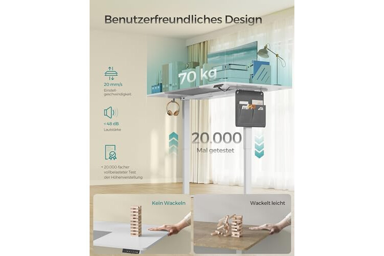 Gute Verarbeitung: Mit dem robusten Stahlrahmen und der dicken Tischplatte ist dieser Tisch bis zu 70 kg belastbar; der hochwertige Motor für eine gleichmäßige und geräuschlose Verstellung (< 48 dB)