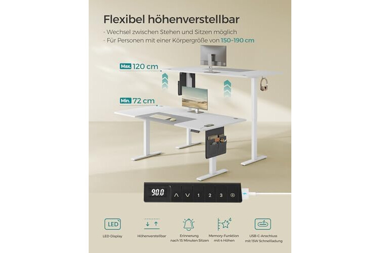 Gesunde Haltung fördern: Zwischen 72 und 120 cm höhenverstellbar, Wechsel zwischen Sitzen und Stehen; außerdem können der Tisch insgesamt 4 Höhen als Schnelleinstellung gespeichert werden