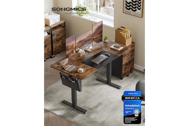 SONGMICS Höhenverstellbarer Schreibtisch elektrisch, 140 x 60 cm, stufenlos verstellbar, Memory-Funktion mit 4 Höhen, vintagebraun-tintenschwarz LSD016X01