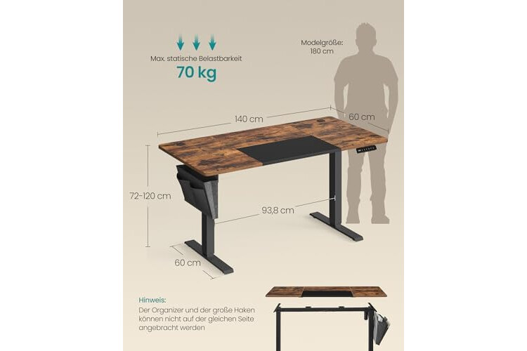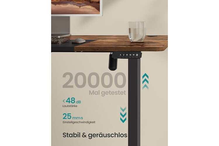 Gute Verarbeitung: Mit dem robusten Stahlrahmen und der dicken Tischplatte ist dieser Tisch bis zu 70 kg belastbar; hochwertige Motor für eine gleichmäßige und geräuschlose Verstellung (< 48 dB)
