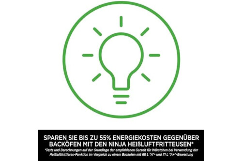 SPAREN SIE BIS ZU 55% Energiekosten gegenüber Backöfen mit Ninja Heißluftfritteusen* (*Tests & Berechnungen auf Grundlage der empfohlenen Garzeit für Würstchen bei Verwenden der Heißluftfrittieren-Funktion im Vergleich zu zwei repräsentativen Öfen)