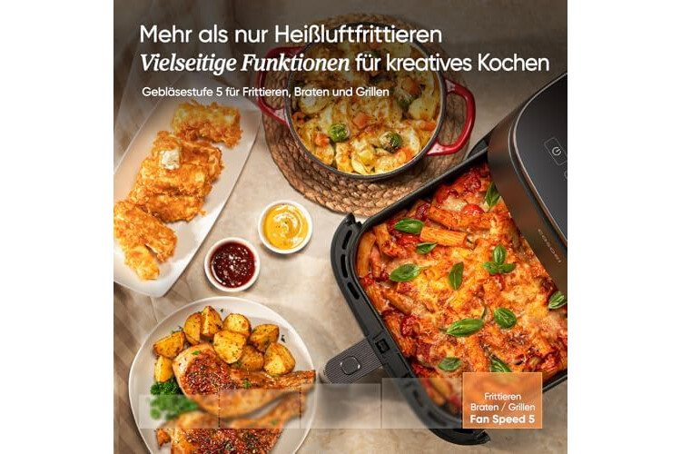 𝗩𝗶𝗲𝗹𝘀𝗲𝗶𝘁𝗲 𝗞𝗼𝗰𝗵𝗳𝘂𝗻𝗸𝘁𝗶𝗼𝗻𝗲𝗻: Die Funktionen für Frittieren, Braten und Grillen bei Gebläsestufe 5 eignen sich für jedes Gericht – vom Frühstück bis zum Abendessen.