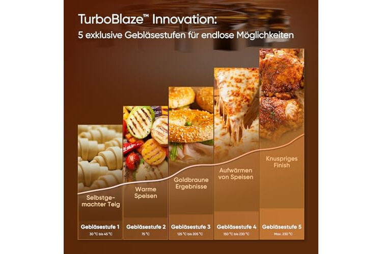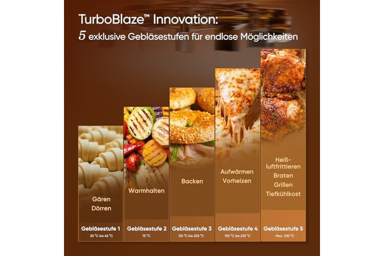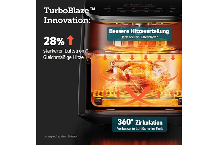 𝗧𝘂𝗿𝗯𝗼𝗕𝗹𝗮𝘇𝗲-𝗜𝗻𝗻𝗼𝘃𝗮𝘁𝗶𝗼𝗻:Die TurboBlaze Airfryer ist mit einem Gleichstrommotor mit fünf Gebläsestufen und einer präzisen Temperaturregelung von 30 bis 230 °C ausgestattet. Damit bietet sie vielseitige Funktionen für perfekte Ergebnisse bei jedem Gericht.