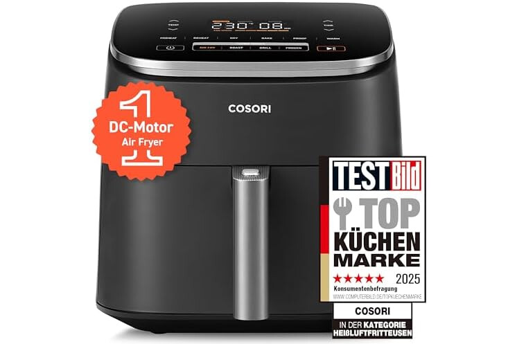 Cosori Turboblaze Airfryer Heißluftfritteuse, 9-in-1 Air Fryer XXL 6L, leiser DC Motor mit 5 Geschwindigkeitsstufen, Grillen, Backen, Gären, Dehydrieren, Tiefkühlen, 87 Rezepte, 64% energiesparend