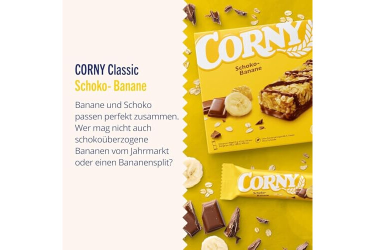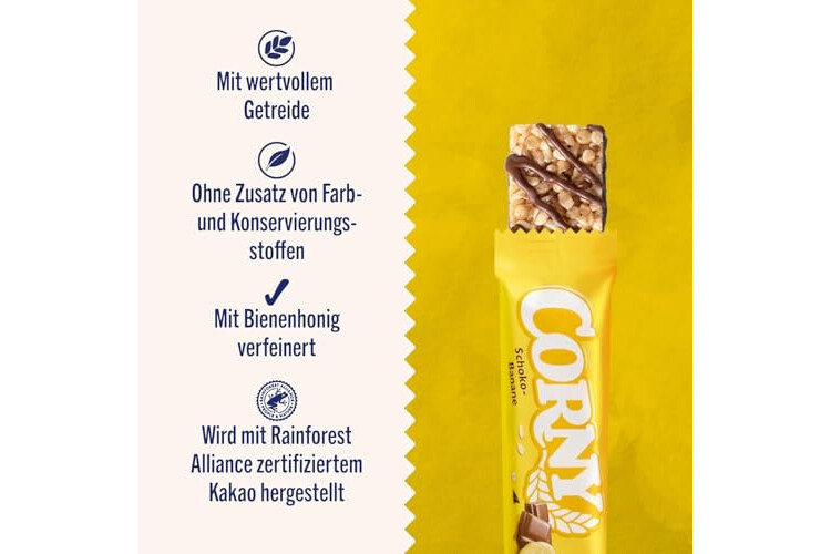 • Der Corny Schoko-Banane Müsliriegel mit einer leckeren Kombination aus SCHOKO und BANANE ist der ideale SNACK für jede Gelegenheit