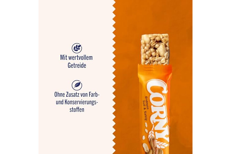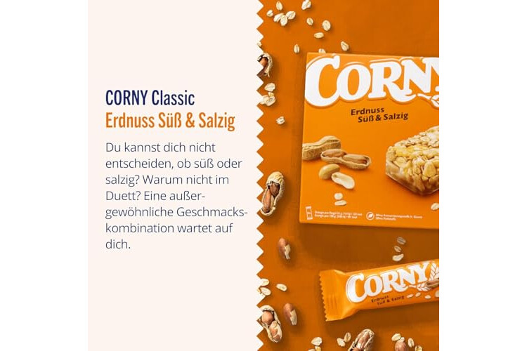 Der Corny Süß & Salzig Müsliriegel mit einer leckeren Kombination aus Erdnüssen und süß/salzigem Geschmack ist der ideale Snack für jede Gelegenheit - ein unwiderstehliches Geschmackserlebnis