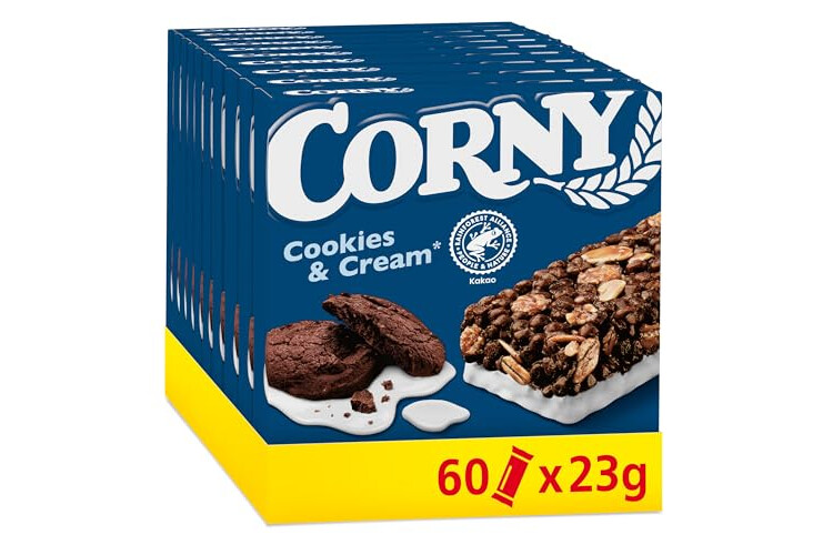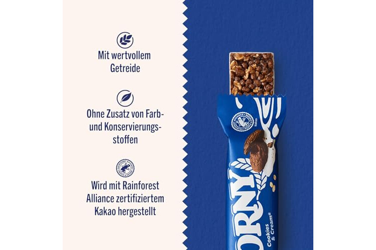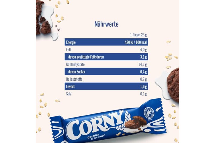 Die beliebten Keks-Riegel werden mit wertvollem Getreide und feinsten Cookies hergestellt - Ohne Farbstoffe und ohne Zusatz von Konservierungsstoffen, aber dafür mit 100% echtem Corny Geschmack, wie man ihn kennt