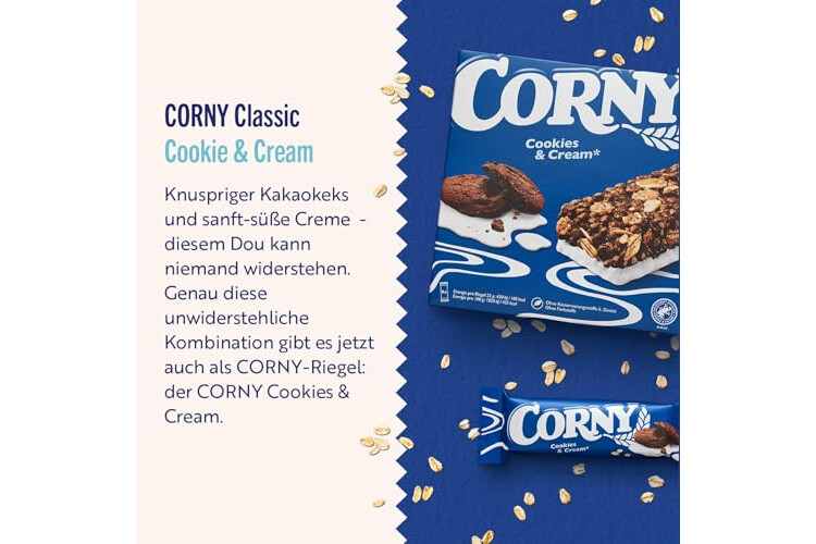 Ideal als Energiespender beim Wandern, Radfahren, in der Schule, im Büro oder einfach zuhause auf der Couch - Corny Classic Cookies & Cream passt einfach zu fast jed...