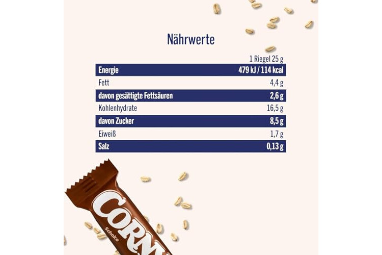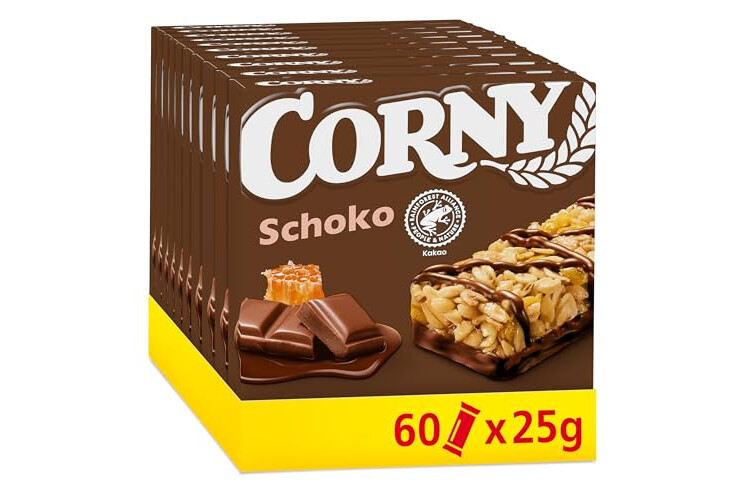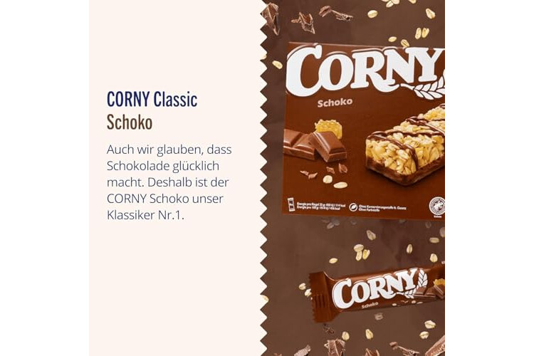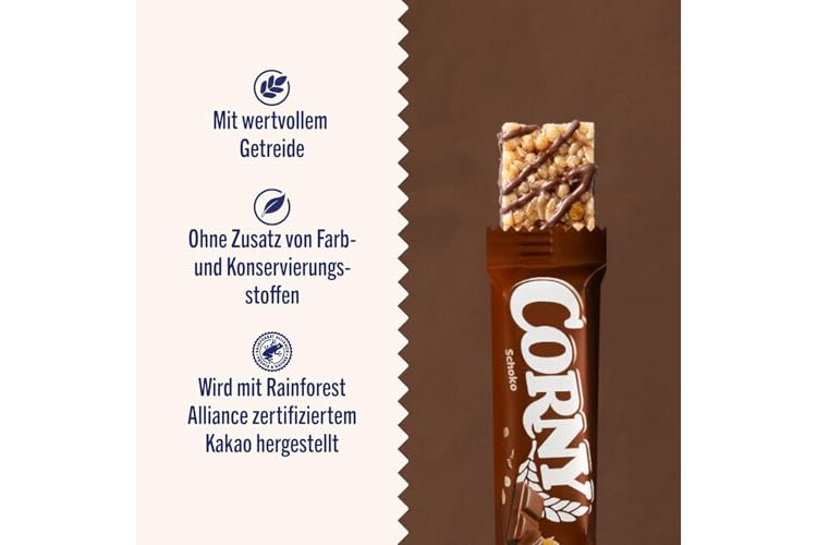 Der Corny Schoko Müsliriegel mit einer leckeren Kombination aus Schokolade, Hafer, gerösteten Erdnüssen und Honig: der ideale Snack für jede Gelegenheit - ein unwiderstehliches Geschmackserlebnis
