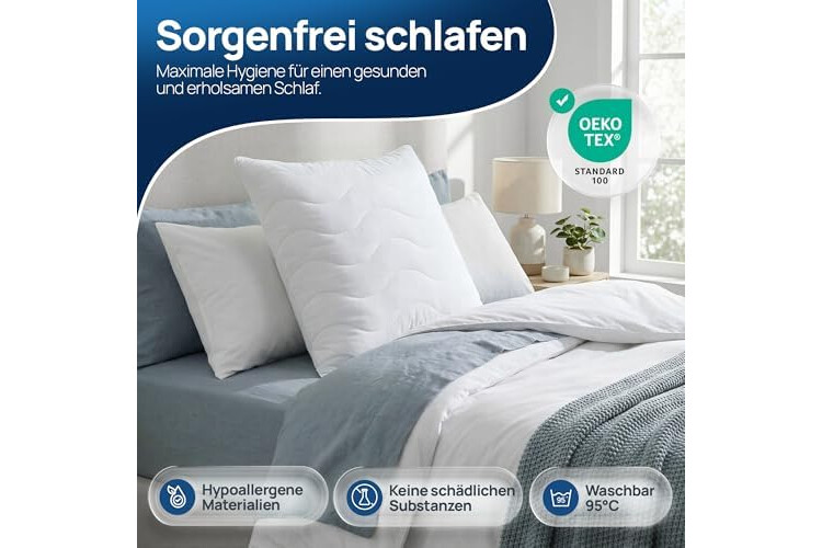 ✅ ALLERGIKERFREUNDLICH - Unser Schlafkissen 80 x 80 sorgt dank allergikerfreundlicher Mikrofaser für maximale Keim- und Milbenfreiheit. Zudem kann es bei bis zu 95 °C gewaschen werden und ist nach Oeko-Tex 100 zertifiziert, sowie auf Schadstofffreiheit geprüft - für sorgenfreie Nächte!
