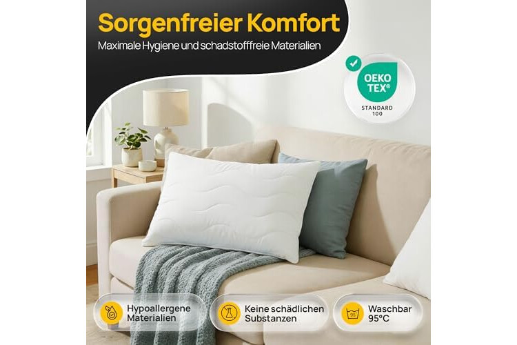 ✅ ALLERGIKERFREUNDLICH – Unser 40x60 Kissen bietet dank allergikerfreundlicher Mikrofaser beste Voraussetzungen für hohe Hygiene. Zudem kann es bei bis zu 95 °C gewaschen werden, was für maximale Keim- und Milbenreinheit sorgt – sowie nach Oeko-Tex 100 zertifiziert und auf Schadstofffreiheit geprüft. Für sorgenfreie Nächte!