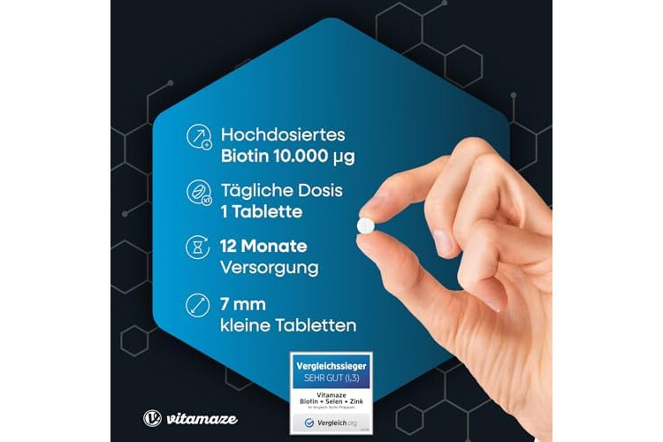 HOCHDOSIERT: 365 kleine, vegane Tabletten für 1 Jahr zur Daueranwendung mit 10.000 mcg Biotin ergänzt mit Zink und Selen die ideale Kombination für Haut, Haarwachstum und Nägel. *VERGLEICHSSIEGER 2018 beim Verbrauchermagazin vergleich.org.