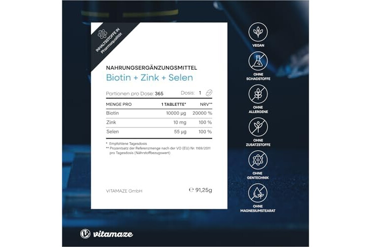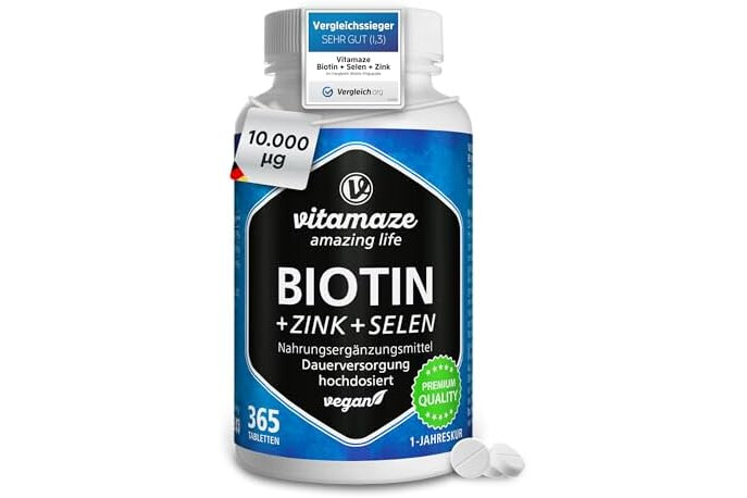 Biotin hochdosiert 10.000 mcg + Selen + Zink für Haarwuchs, Haut & Nägel, 365 vegane Tabletten für 1 Jahr, Nahrungsergänzung ohne Zusatzstoffe, Made in Germany