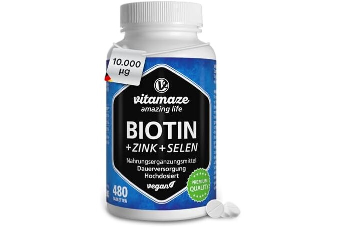 Biotin hochdosiert 10.000 mcg + Selen + Zink für Haarwuchs, Haut & Nägel, 480 vegane Tabletten für 480 Tage, Nahrungsergänzung ohne Zusatzstoffe, Made in Germany