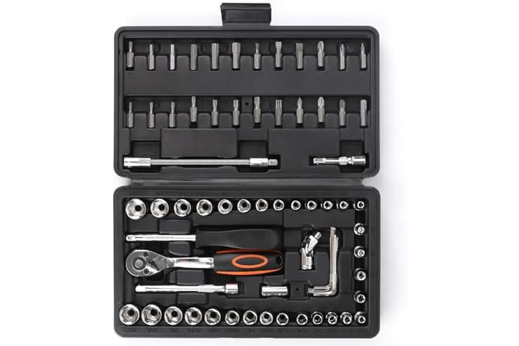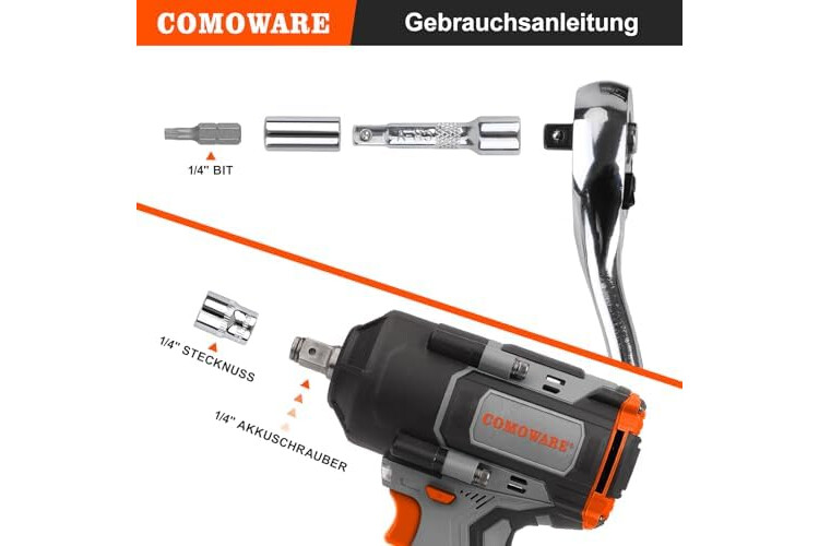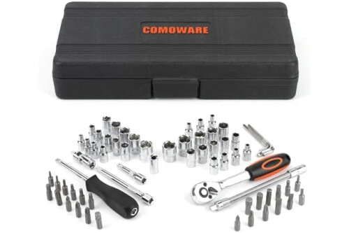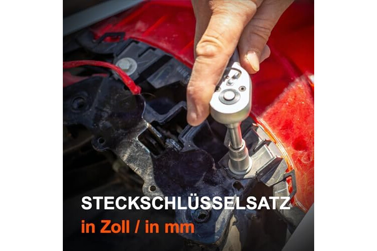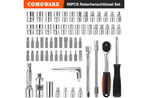 1/4" STECKSCHLÜSSELSATZ: Unser Ratschenkasten enthält einen 1/4" Drehmomentschlüssel mit 72 Zähnen, mit dem Sie präziser und flexibler arbeiten können. Außerdem hat COMOWARE 31 Steckschlüsseln mit Chromüberzug: 5/32", 3/16", 7/32", 1/4", 9/32", 5/16", 11/32", 3/8", 13/32", 7/16", 15/32", 1/2", 17/32", 9/16"; 4, 4.5, 5, 5.5, 6, 7, 8, 9, 10, 11, 12, 13, 14mm; Hexagramm 4-7mm. Unser Knarrenkasten umfasst noch Verlängerungsstangen und Bitset.