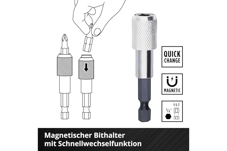 Schnellwechselbithalter – Für einen schnellen und einfachen Bitwechsel sorgt der im Einhell Zubehör-Set enthaltene 60 mm lange Schnellwechselbithalter aus Karbonstahl.