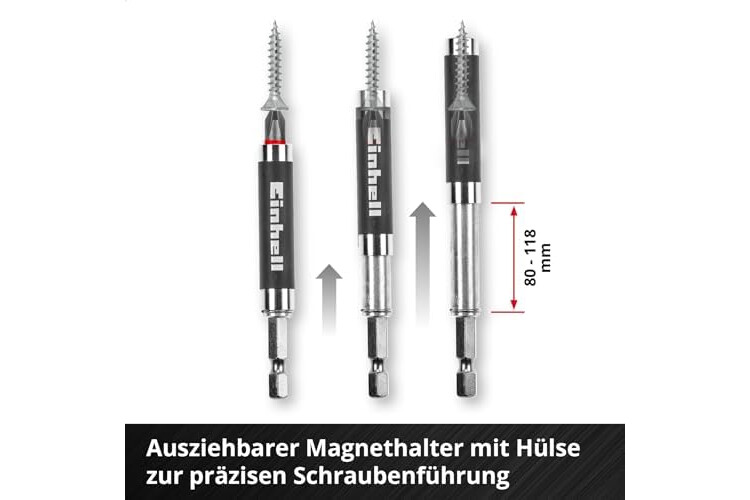 Ausziehbarer Magnethalter – Mit dem zwischen 80 und 118 mm verstellbaren Magnethalter des Einhell Cases aus robustem Werkzeugstahl, ist eine präzise Schraubenführung möglich.