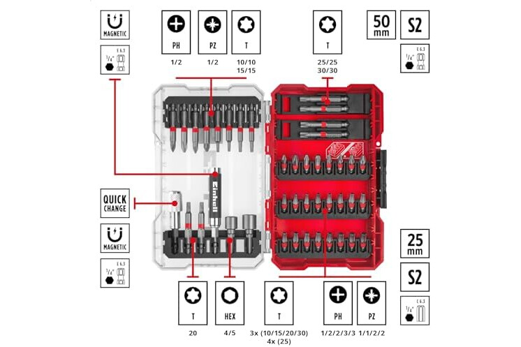 Robuste Bits – Dank des grau sandgestrahlten S2 Stahls überzeugen die im Einhell Bit-Set enthaltenen 25- und 50-mm-Bits mit höchster Qualität und Langlebigkeit.
