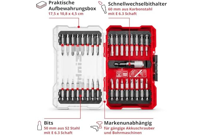Original Einhell M-CASE 33-tlg. Bit-Set (für Akkuschrauber und Bohrmaschinen mit 50-mm-Bits aus S2 Stahl, Schnellwechselbithalter aus Karbonstahl inkl. Aufbewahrungsbox)